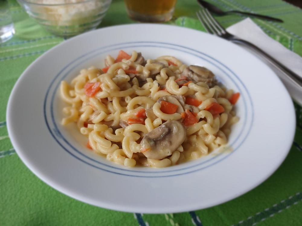 Tortellinis de queso y espirales con champiñones y nata