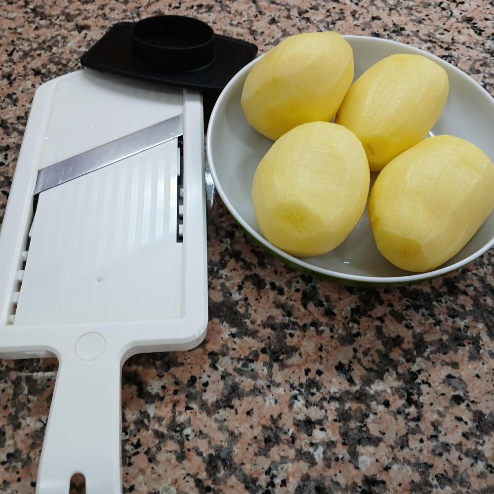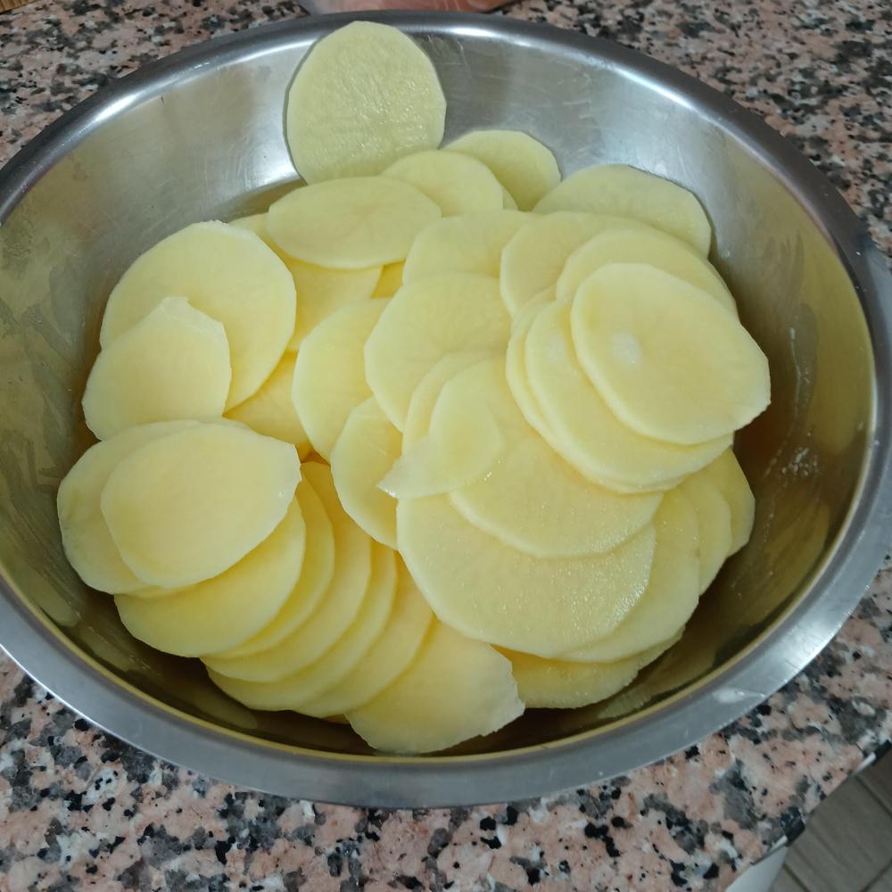 Primero, pelamos y cortamos la patata en rodajas no demasiado gruesas.