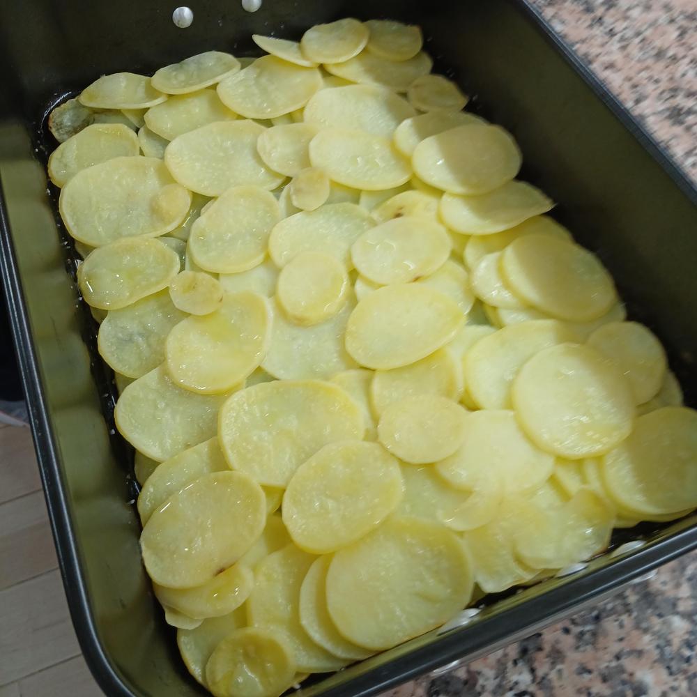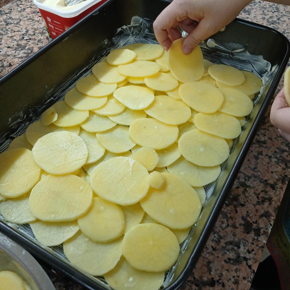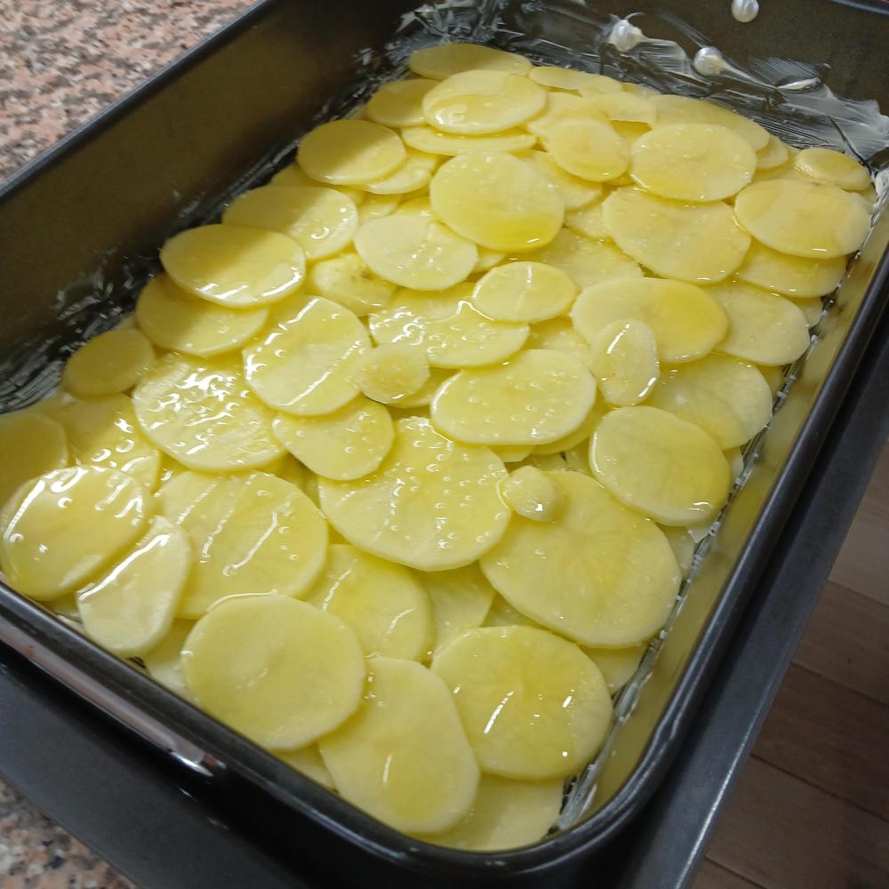 Untamos una bandeja de horno con margarina o aceite de oliva y disponemos las patatas en capas, añat sal y aceite y horneamos media hora en horno precalentado a 180 grados con calor arriba y abajo.