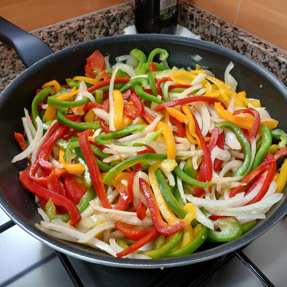 En una sartén con un chorro de aceite de oliva, pocharemos la cebolla y los pimientos, añadiendo un poco de sal.