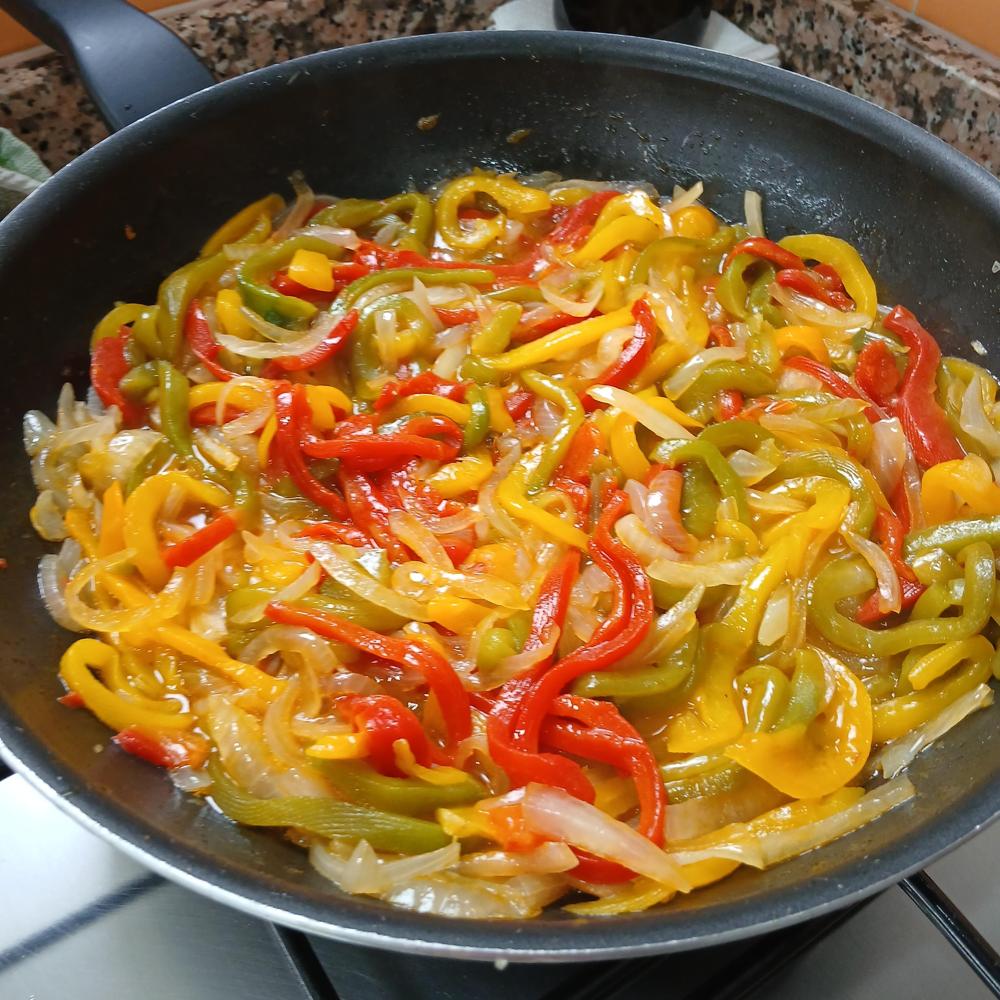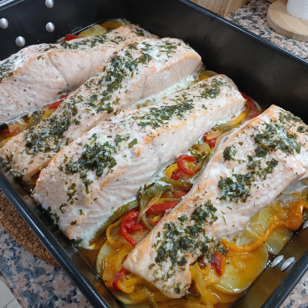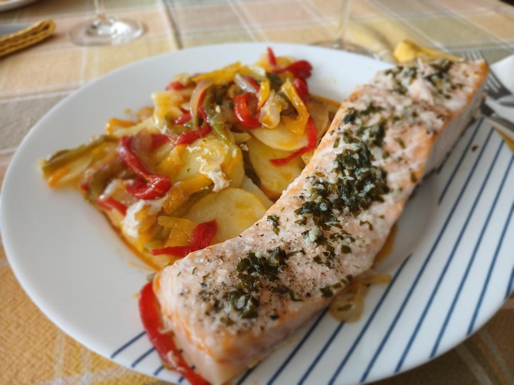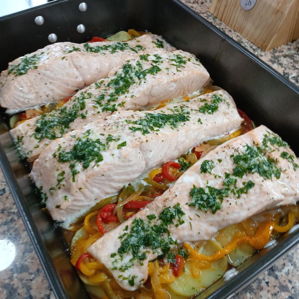 Salmón con pimientos y cebolla
