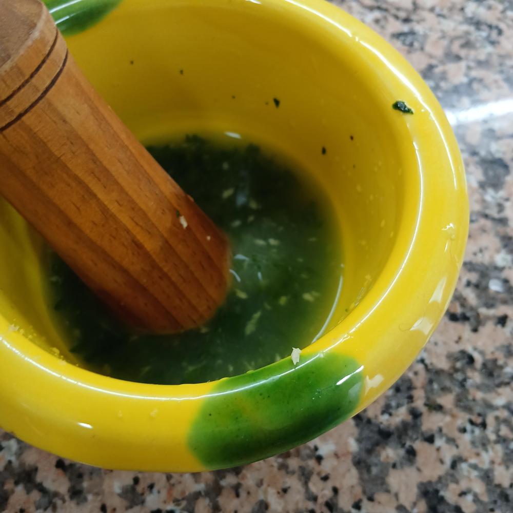 Mientras, pelamos y machacamos el ajo finito junto con el perejil y vertemos encima el vino blanco, formando así el caldo con el que bañaremos mas tarde al salmón.