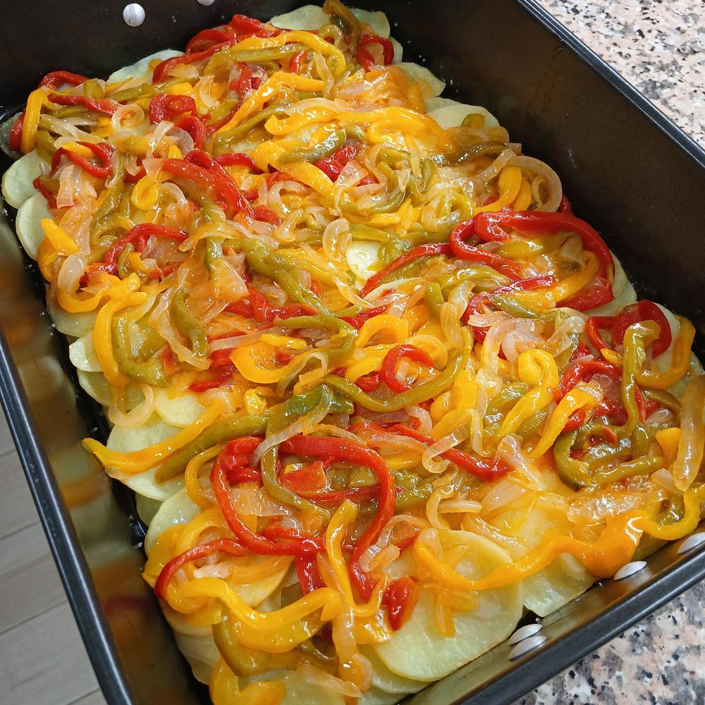 Una vez estén hechas las patatas colocaremos encima el los pimientos, el salmón salpimentándolo y un chorrito de aceite