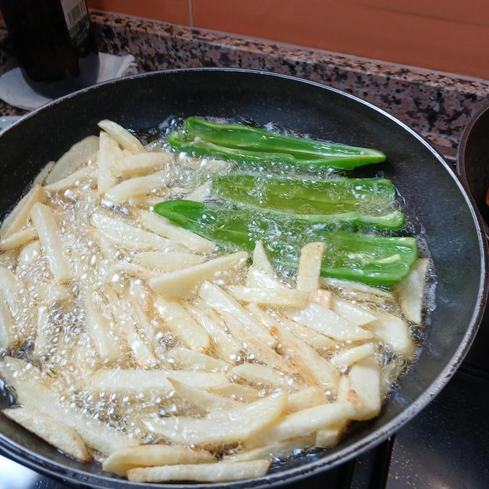 Freímos los pimientos sin rabo ni pepitas, cortados por la mitad. Si freímos patatas los podenos hacer a la vez.