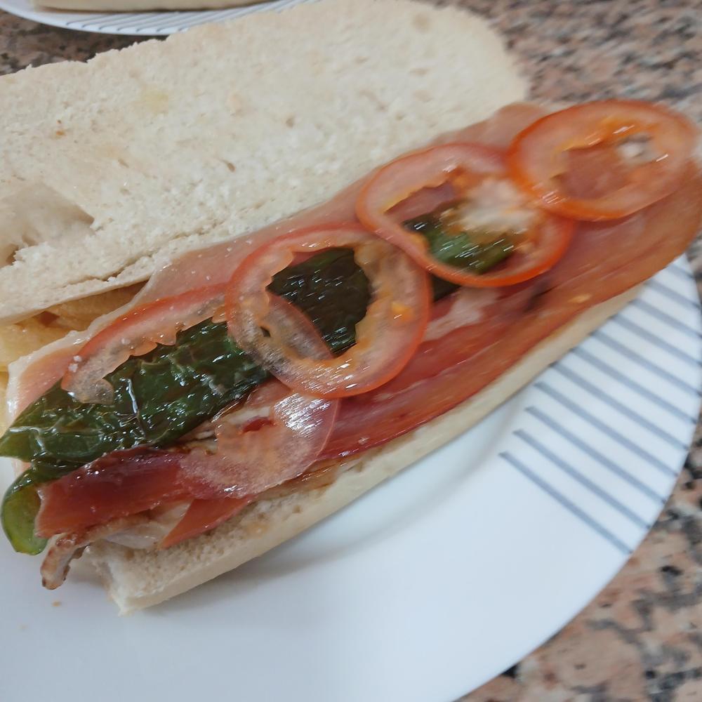 En orden, colocamos los filetitos, la loncha de jamón, el pimiento y las rodajas de tomate.