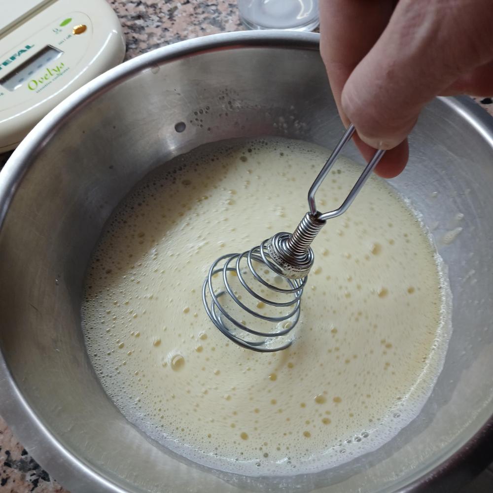 Batimos el huevo con el azúcar. Añadimos la leche y batimos.